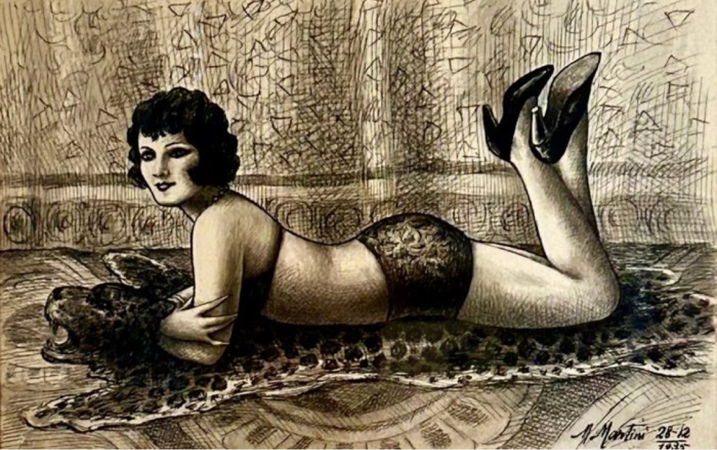 Ancora oggi poco studiato e forse un po’ dimenticato, Marcello Martini, poco più che ventenne, realizzava l’indimenticabile figura di questo:”ritratto di donna del cabaret”, resa elegante e raffinata e veristica dell’illuminazione incidente, suggestiva e straordinaria nella rivelazione di ogni più piccolo dettaglio del soggetto, fisico e caratteriale.